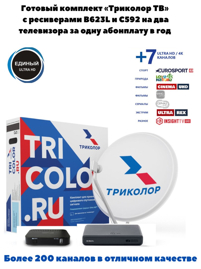 Универсальный комплект для подключения спутникового ТВ Триколор на 2ТВ с приёмниками GS B623L и С592, предназначен для просмотра контента на всей территории покрытия спутников Триколора.