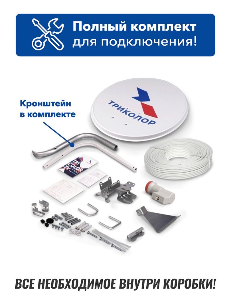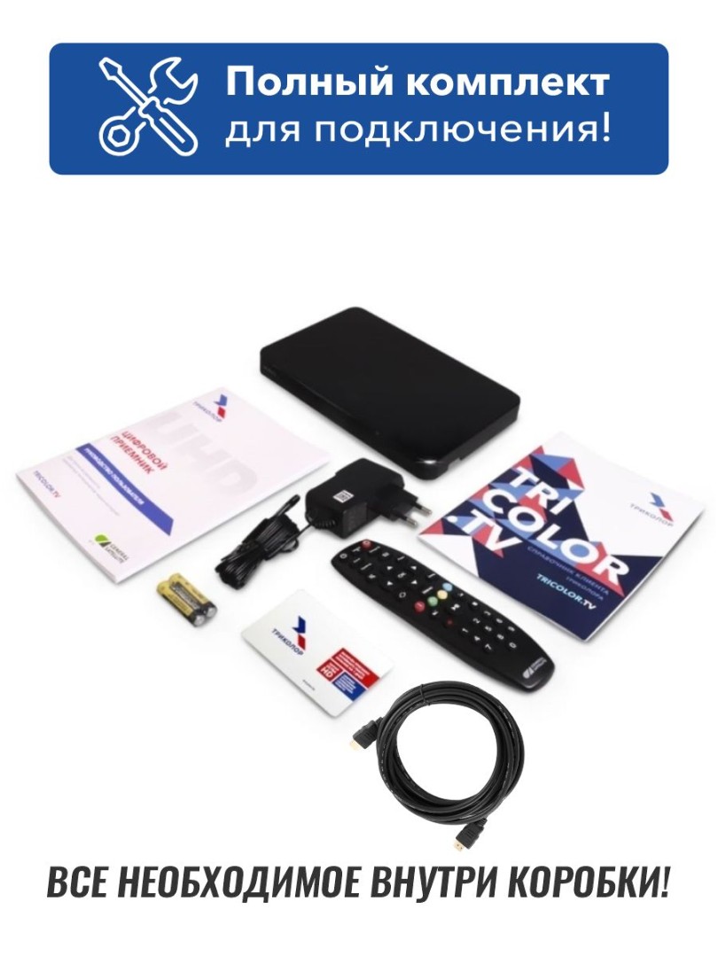 Комплект оборудования с антенной и гибридной приставкой открывает доступ к спутниковым каналам и вещанию онлайн в форматах SD, HD и 4K, в зависимости от разрешения вашего телевизора, а также к сервисам «Триколор»: - родительский контроль; - сервис «Кинозалы»; - умный дом; - управление эфиром; - запись передач и фильмов, при наличии подключенного USB-носителя или жесткого диска. ТВ-приставка подключается к любому телевизору через кабель HDMI или аналоговый выход AV Jack 3.5 мм — RCA (в комплект не входит).