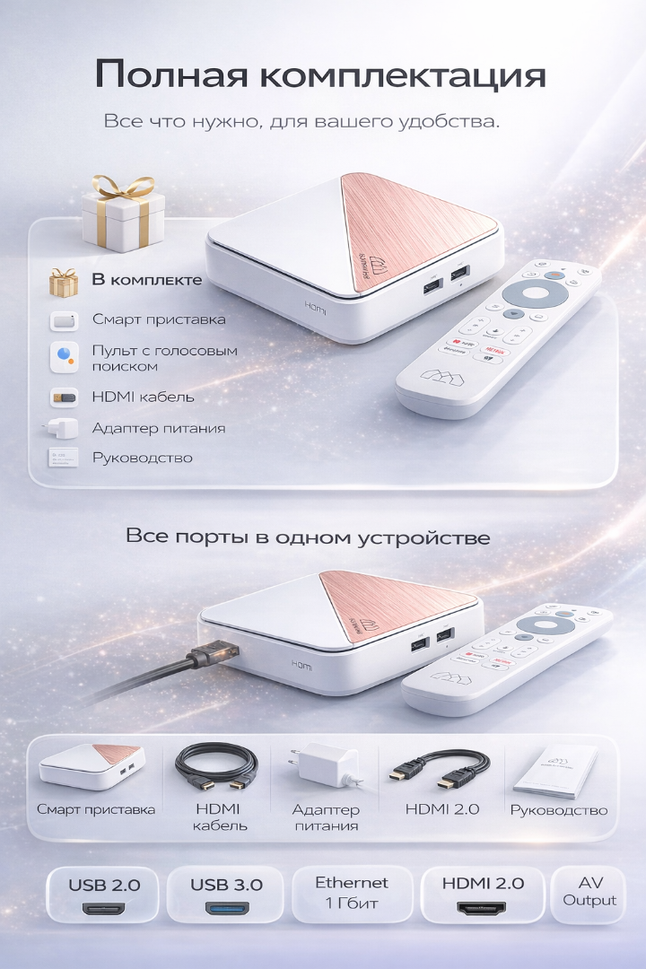 Пульт дистанционного управления: В комплекте идет пульт, который удобно управляет приставкой, а также поддерживает голосовые команды и имеет кнопки быстрого доступа к основным сервисам.
