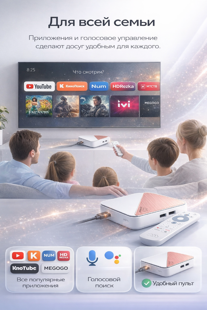 Голосовое управление: Поддержка Google Assistant и Amazon Alexa, что позволяет управлять приставкой голосом. Вы можете включать и выключать телевизор, менять каналы, искать контент или управлять умными устройствами дома.