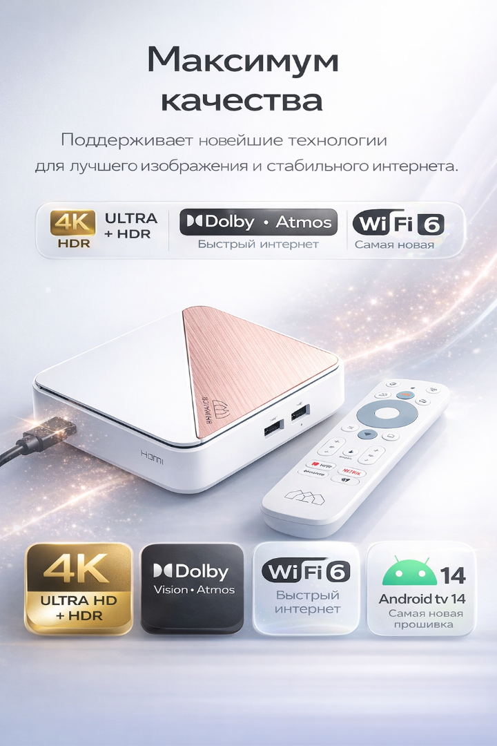 Разрешение 4K (Ultra HD): Смарт приставка поддерживает воспроизведение контента в разрешении 4K (3840x2160 пикселей), что обеспечивает великолепное качество изображения с четкими деталями и яркими цветами. Погружайтесь в мир ультра-реалистичного контента, который оживляет каждую сцену.