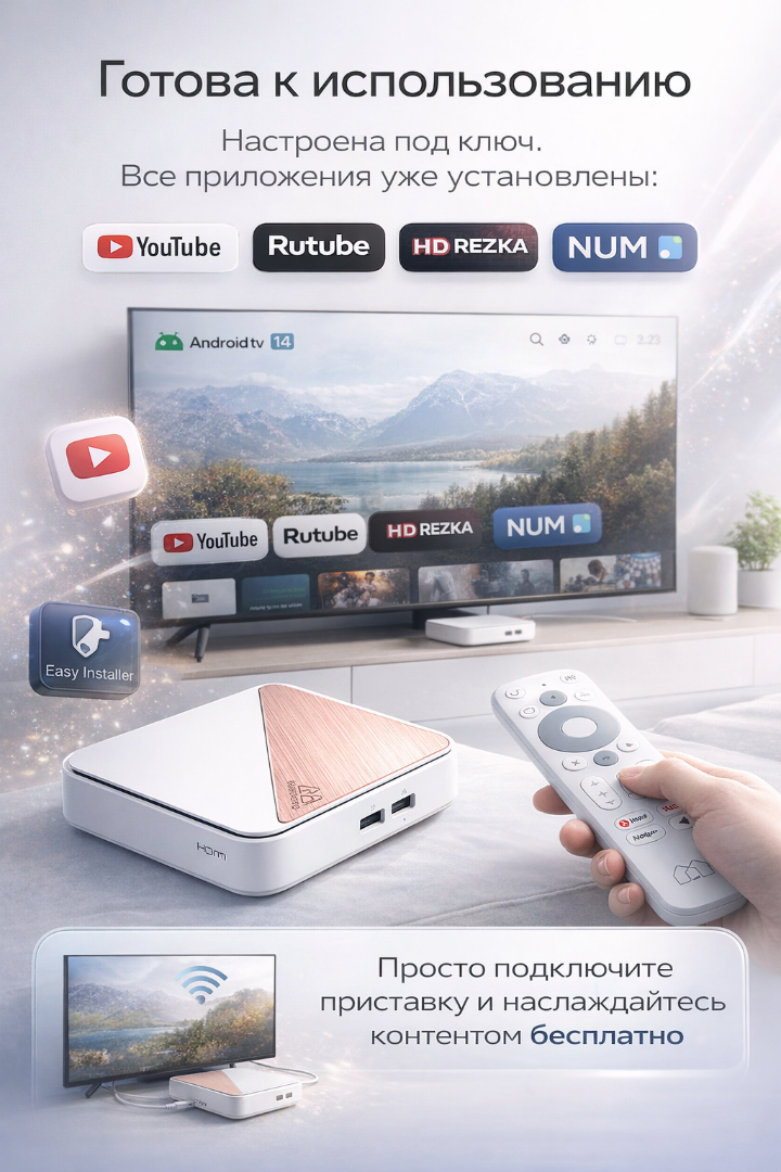 Приставка настроена под ключ. Установлена прошивка Андроид ТВ 14 !!! Dune Media Center тоже установлен. Установлены самые популярные приложения для бесплатного просмотра фильмов , сериалов и телевизионных каналов. Установлен инсталятор EasyInstaller ( если мало приложений можно установить из него.)